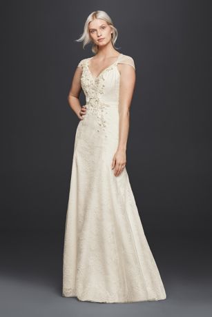 Light and airy, this sheath wedding dress will steal your heart with 3D floral appliques that bloom across the plunging V-neckline and bodice. Weightless tulle layered over lace floats elegantly as you walk down the aisle or twirl on the dance floor.