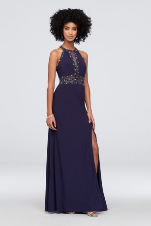Prepare to dazzle in this slinky jersey sheath dress, featuring a crystal-trimmed bodice, and illusion mesh at the waist and back.