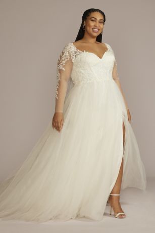 This corset-style wedding dress is as chic as it is sexy. Features a sheer lace applique sweetheart bodice detailed with over 3,000 beads. The grand skirt made from 27 yards of tulle adds flattering shape and movement. A dramatic front slit gives the gown an alluring finishing touch.