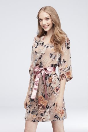 Burnout velvet flowers add textural allure to this sheer mesh robe. Accented by metallic touches and a pink satin sash for extra femininity.