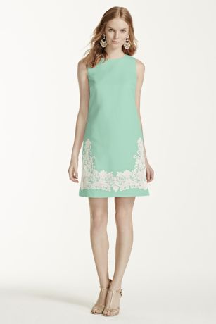- Sleeveless short faille shift dress features ivory lace appliques.