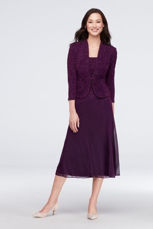 With the look of a three-piece ensemble and the sophisticated ease of a dress and jacket, this chiffon knee-length dress is topped with a shimmering jacquard bodice and matching jacket.