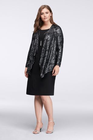 This scoopneck jersey LBD offers the look of a complete ensemble in one easy piece, drapey metallic-shimmer jacket and tasseled lariat necklace included.