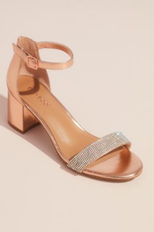 This pair of block heel sandals brings the brilliance with a crystal-encrusted toe strap and a high-shine metallic heel and toe pad.