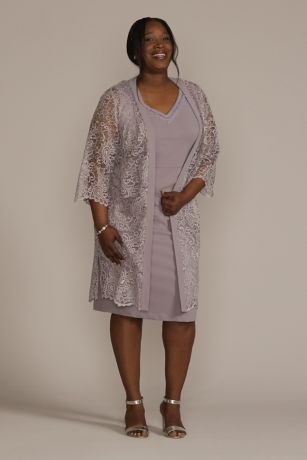 This knee-length plus-size sheath dress is detailed with a beaded V-neckline and comes with a matching jacket featuring sheer three-quarter sleeves.