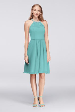 Luminous pearls and sparkling crystals create a lovely, face-framing collar on this short chiffon bridesmaid dress.