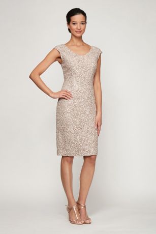 Swirling sequins and corded embroidery top this short-and-sweet sheath dress, while a V-neckline and cap sleeves add delightful finishing touches.