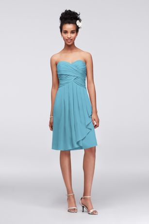 This strapless style is great for a bridesmaid and offers plenty of wear-again potential.Ruching detail shapes a stunning sweetheart neckline that flatters any body type. Crinkle chiffon flows to create a front cascade that adds dimension and romance.