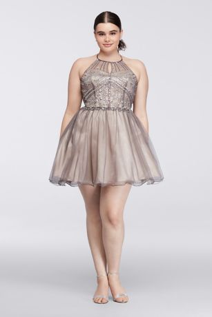 We can't decide what we love most about this short homecoming dress, the flouncy skirt or the beaded bodice with keyhole neckline.