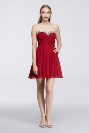This short dress's shirred crossover bodice is endlessly flattering, especially paired with a crystal-covered sweetheart neckline and an A-line silhouette.