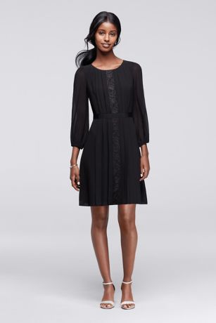 Illusion long sleeves, lace banding, and a pleated skirt make this work dress supremely flattering.