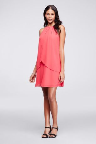 Swingy chiffon layers give this sleeveless short dress a mod vibe. The beaded neckline and back keyhole cutout make it perfect for your next party.