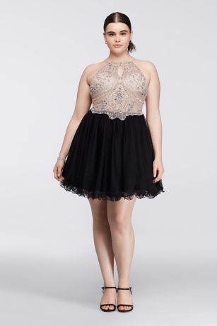 The detailed beading on the bodice of this short halter dress is nothing short of astounding. The scrolling shimmer on top perfectly complements the solid skirt.