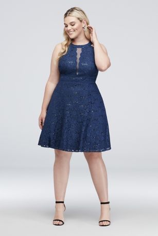 Don't be fooled by the high neckline: This short plus size dress is full of flirty details, including glitter lace, a mesh inset down the center of the bodice, and scalloped edges.