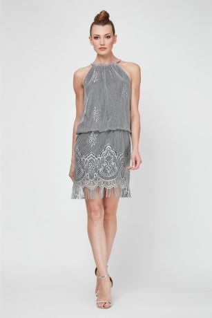 Perfect for the fashionable mother of the bride or groom, this short metallic dress features a high neckline, a blouson waist, and a crocheted hem.