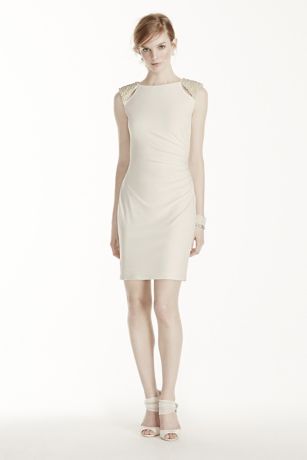 This short jersey casual wedding dress defines chic. It features pearl accents and cutout shoulders making it the perfect choice for your special day!