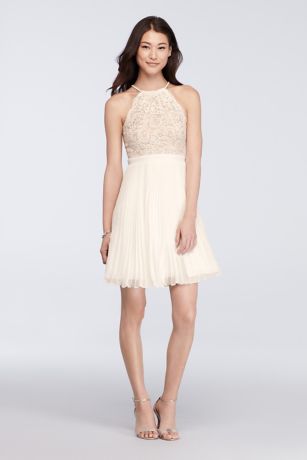 Contrasting textures make this short dress a standout party option. The lace bodice with halter neckline pairs prettily with the short pleated skirt.