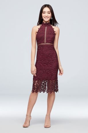 Short, stylish, and stunning, this lace halter dress features a strappy open back and illusion details on the bodice and hem.