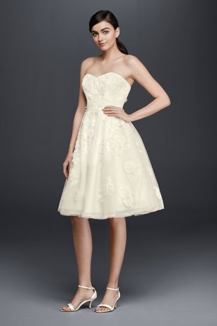 This short wedding dress is designed with a twirl-worthy skirt that's made for dancing. The beaded lace appliques imbue the strapless bodice with modern femininity and rich texture.