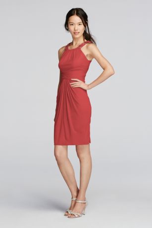 Accentuate your waist with the perfectly placed crisscross draping on this short mesh bridesmaid dress, adorned with beads on the straps.
