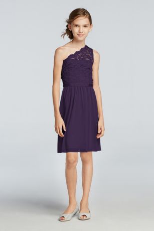 Just for junior bridesmaids, our scaled down version of this short mesh and lace bridesmaid dress comes with an optional spaghetti strap.