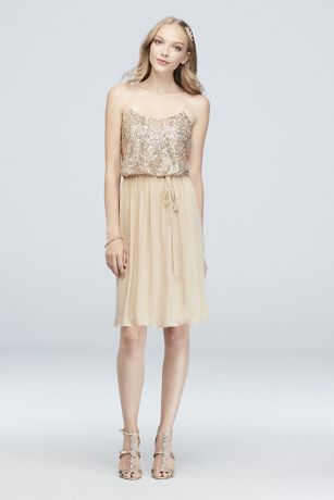 Get glowing in this short bridesmaid dress, fitted with spaghetti straps, a sequin-bedecked blouson top, and a knee-length georgette skirt. The removable sash can be tied at the front, back, or side, depending on your mood.