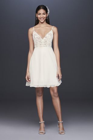 Perfect for casual ceremonies, bridal showers, or bachelorette parties, this little white dress features a sheer embroidered bodice and a short organza A-line skirt accented with crystals at waist and sleeves.