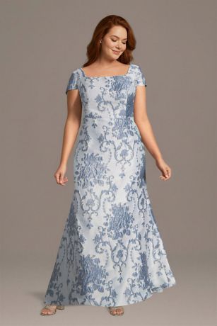 This short-sleeve brocade mermaid dress features a modern square neckline and glamorous silhouette. Elegant and sophisticated, it's a perfect choice for chic soirees and weddings.