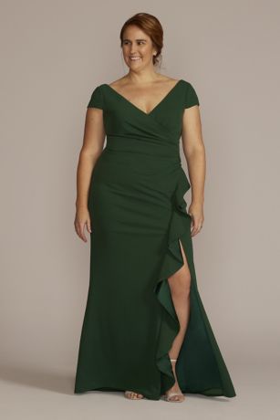 The faux wrap bodice and cascading ruffle on this sheath gown gives effortlessly elegant vibes. Stretch crepe material makes it chic and comfortable option for your next occasion.