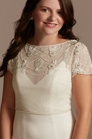 Hand-beaded in a beautiful floral motif, this tulle topper is detailed with fabric-covered buttons down the back and finished with scalloped short sleeves.