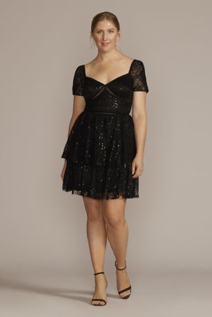 Short Sleeve Illusion Lace Tiered Ruffle Dress