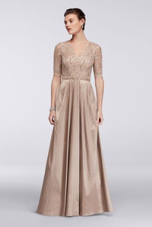 A romantic lace bodice with scalloped V-neckline and relaxed sleeves tops a full, pleated taffeta skirt in this elegant ball gown. A slim band of tonal beads at the waist is a beautiful finishing detail.