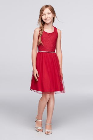 This girls dress is sweet and sophisticated. A sleeveless lace bodice with keyhole back gives way to an airy tulle skirt with an exquisite beaded belt.