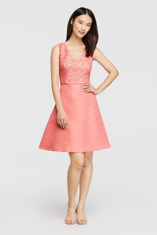 This short party dress combines a subtly floral patterned A-line skirt with a chic illusion bodice for a fun and flirty look. The laser-cut fabric feels especially modern.