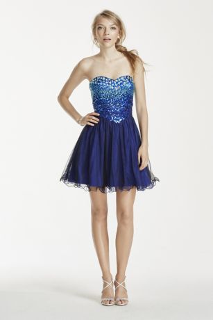 - Strapless bodice is decked out with metallic sequins in a trendy ombre design for some major sparkle and shine.
