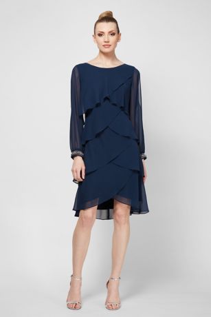 This unique sheath dress is full of wow-worthy details like flowy chiffon tiers, long split sleeves, and beaded cuffs.