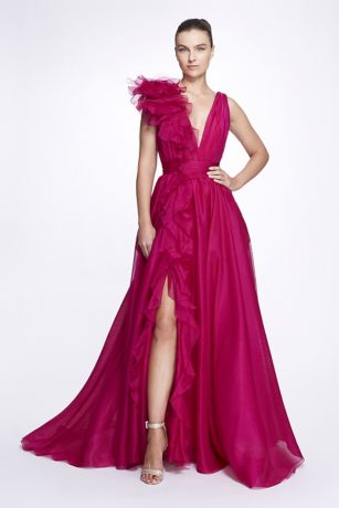 A dreamy silk organza couture ball gown featuring a cascading ruffled slit for soft movement and a dramatic sculptural flower at one shoulder. This ethereal design exudes romance with a modern, whimsical touch.