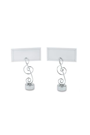 If music be the food of love, play on. Immortal words from William Shakespeare and wonderful reason to favor your guests with Love Songs Place Card/Photo Holder, Kate Aspen's tribute to the harmonies that have become the heart and soul of romance--and our lives. Features and facts: Silver-finish, metal musical clef with sturdy base and slot at the top for place card or photo. Coordinated place card with musical notes in four corners included Favor measures 3" h x 1" w. Sold in a set of four.