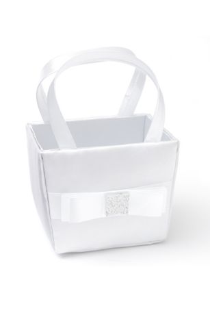 The Simple Bow Flower Girl Basket is adorned with ribbon and a sparkly square button.
