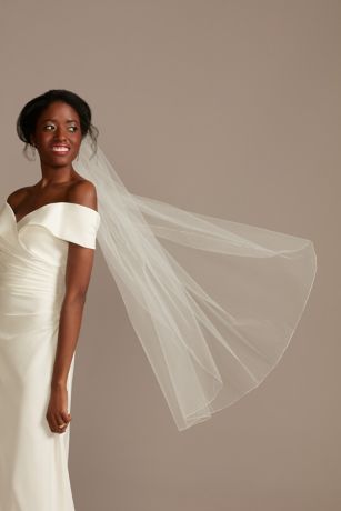A whisper of metallic threading at the edge of this mid-length tulle veil lends the faintest hint of shimmer to your look.