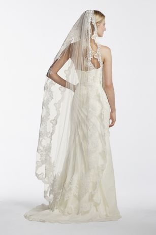 Dramatic scallop edged veil with two rows of lace applique and mantilla comb.