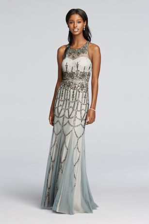 - Floor-length mesh dress is beaded in an intricate, vintage-inspired design that's sure to have all eyes on you.