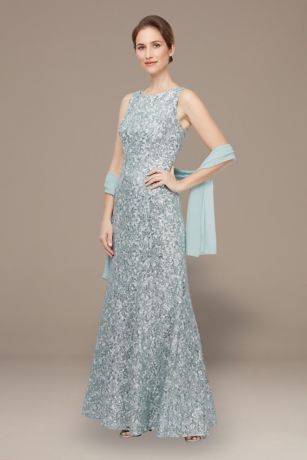 Graceful and refined, this sleeveless fit-and-flare dress features intricate corded detailing for a touch of texture and elegance. Complete with a matching shawl, it's the perfect choice for the mother of the bride or groom!