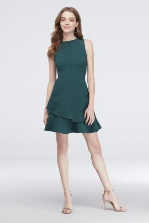 An asymmetrical draped skirt makes this sleeveless, scuba-crepe homecoming dress a little extra-special.