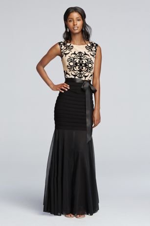 - Banded jersey skirt with sheer trumpet creates a flattering silhouette.