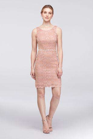 This stretch-lace sheath dress is lent pretty shimmer from a touch of glitter and a crystal-embellished waistband. This style is exclusive to David's Bridal.