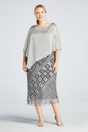 - Long crochet tank metallic dress with fringe hem and chiffon caplet with embellished shoulders.