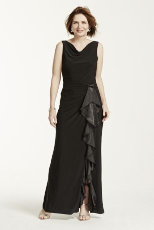 - Long soft jersey skirt with side slit and charmeuse cascading ruffles gives this stunning ensemble a unique flair.