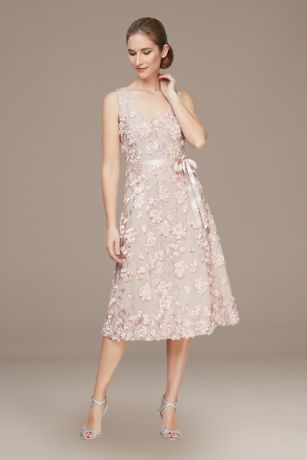 An elegant option for your next big event, this sleeveless tea-length dress features floral embroidery and a satin ribbon at the waist.