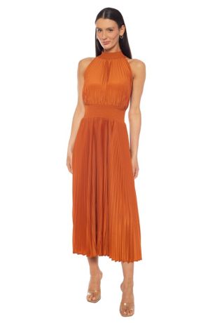 This elegant and refined sleeveless high-neck pleated midi dress offers a graceful silhouette with flowing movement. A sophisticated choice for the mother of the bride or groom, perfect for both ceremony and celebration.